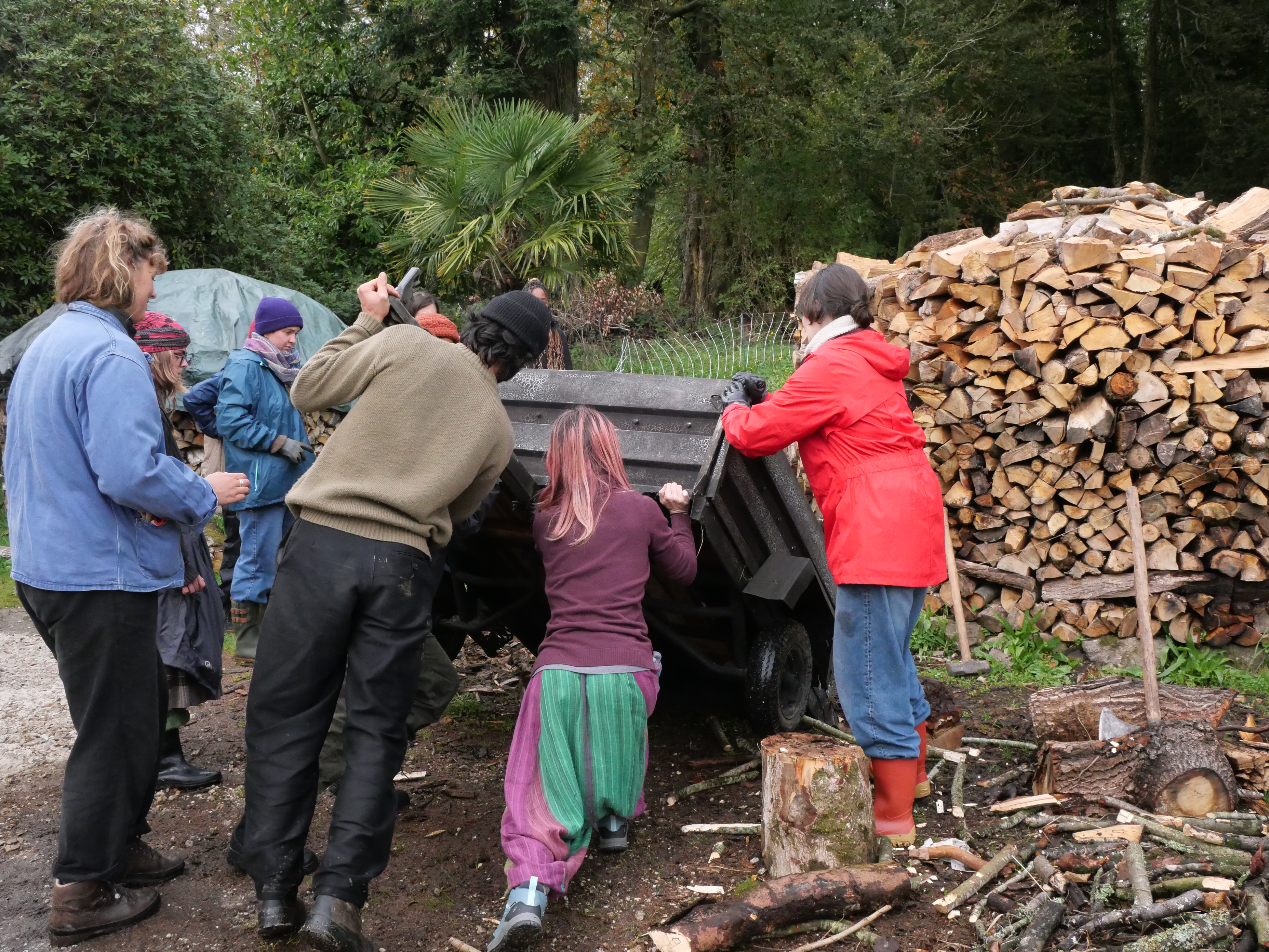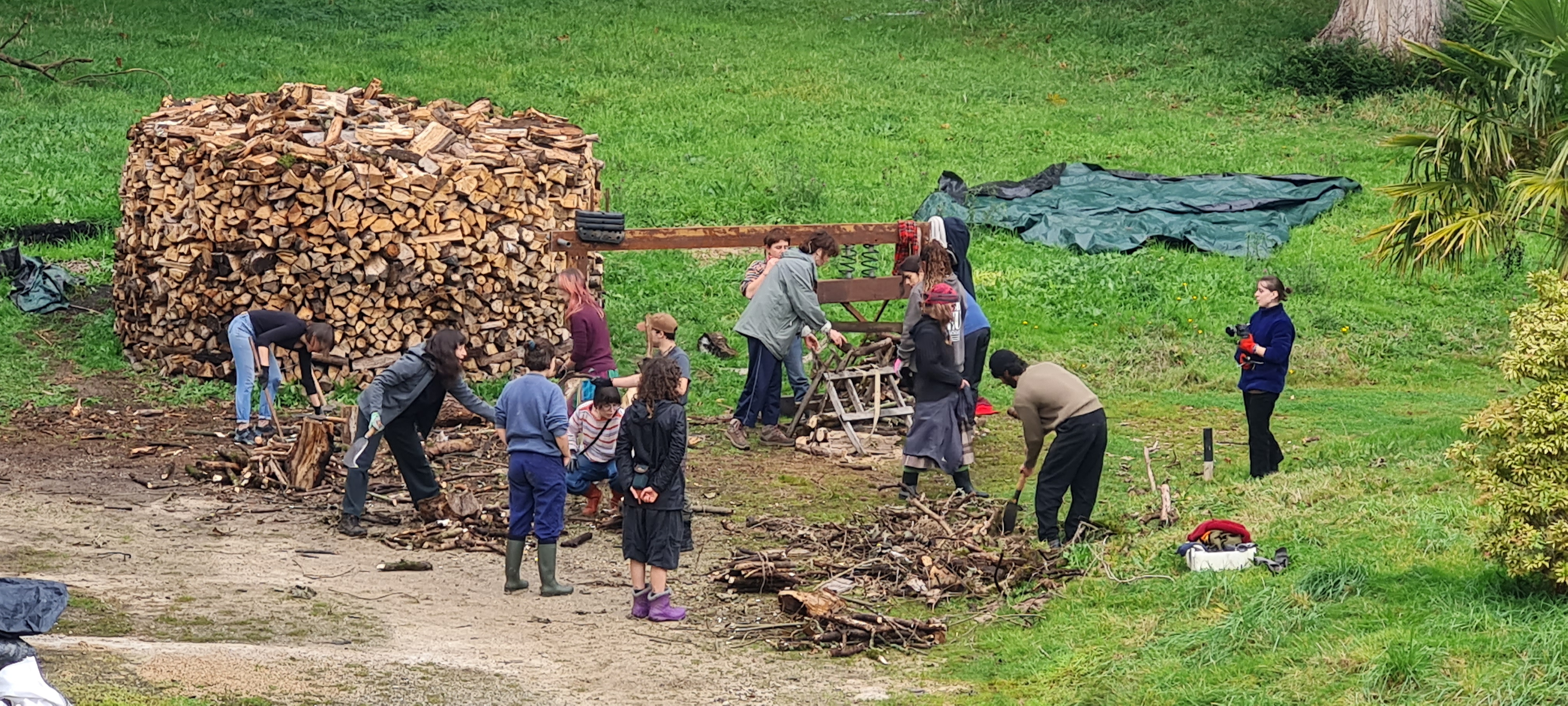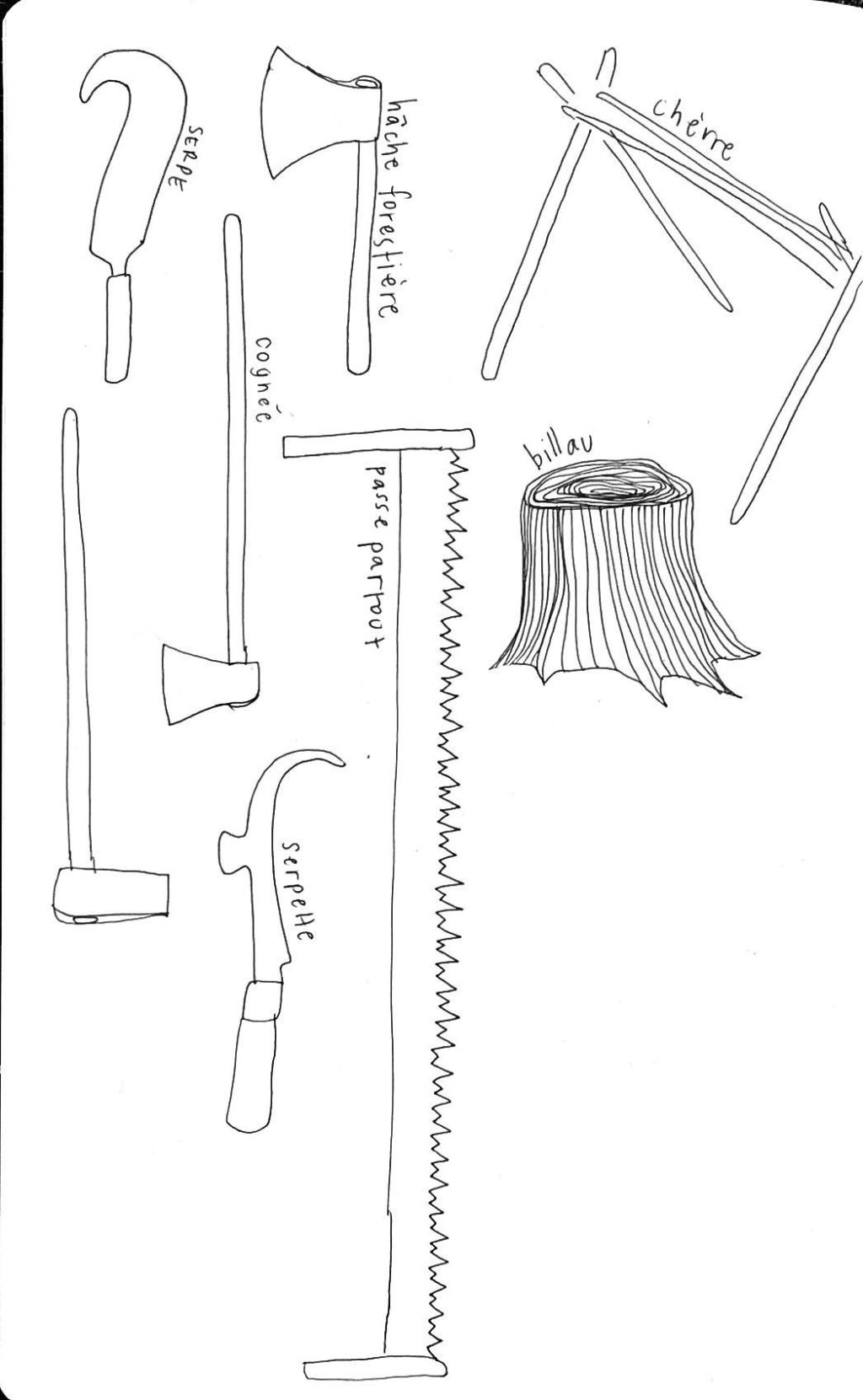 Les Outils qu’on a rencontré à Kerminy et ces gestes qu’on a partagé avec elleux : hache forestière, cognée, passe partout, masse, merlin, serpe, houe, râteau, grelinette, croc?