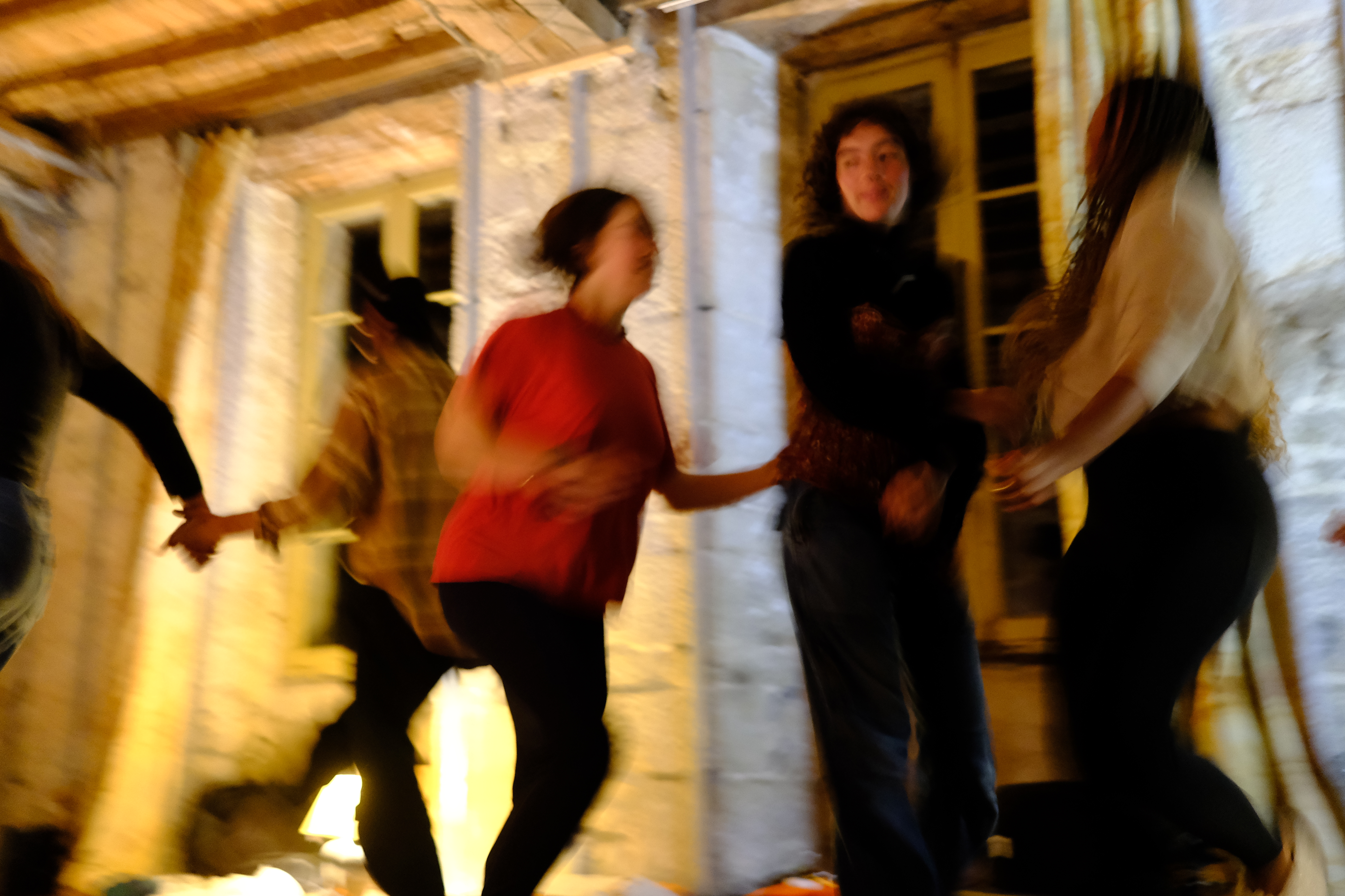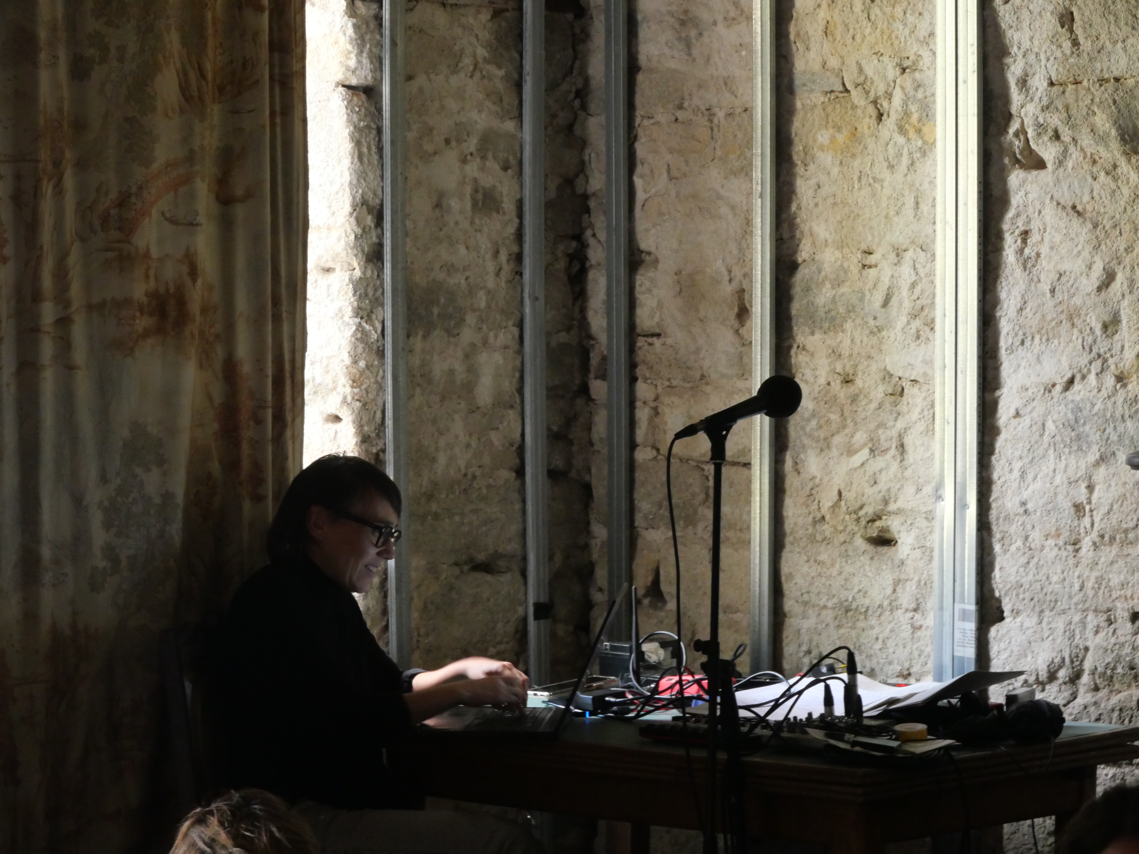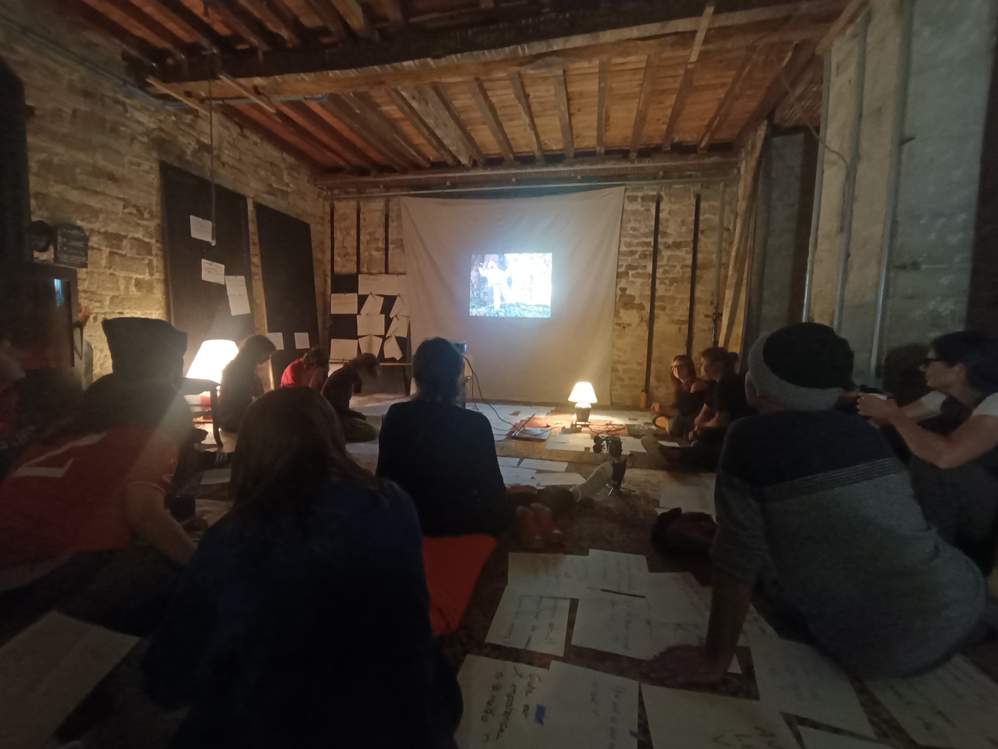 Mes notes, vous ne m’en voudrez pas, sont de moins en moins complètes au fil de ma prise de note le long de cet après-midi qui cherche à fabriquer des petites musiques communes. Les êtres s’allongent, se réchauffent ou se refroidissent, certain.e.s continuent de poser, de se poser, des questions avec leurs voix humaines. D’autres entrent dans des gestes d’enroulement, d’étirement, de tension, de proximité, de façonnage, de lumière et d’ombre. Dehors, le soleil laisse la place à la pluie.
