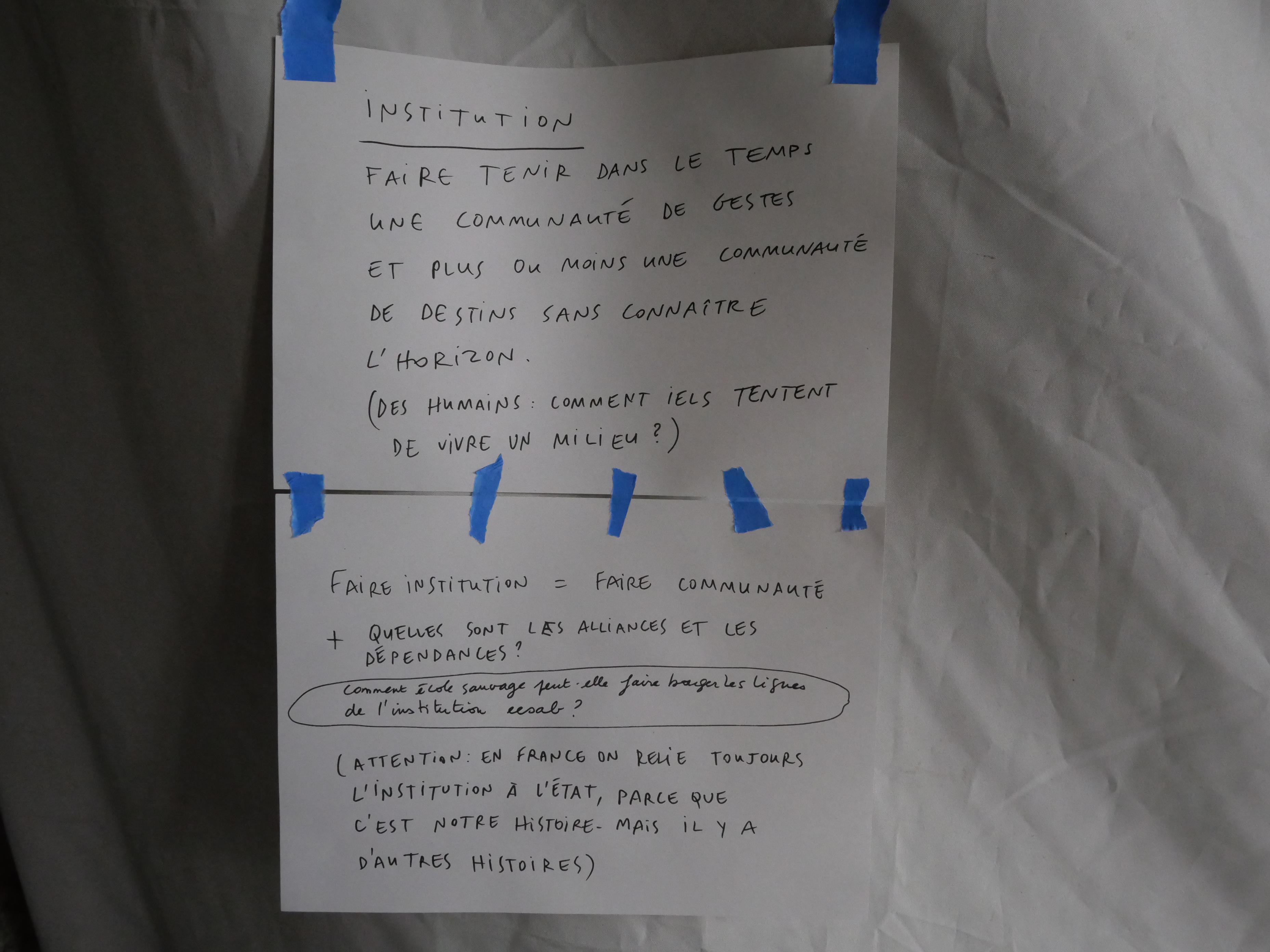 On pense au fonctionnement des arbres, qui ont des liens entre eux. Comment se laisser être influencé.e.s par le milieu, comment se laisser être enseigné.e.s?